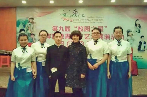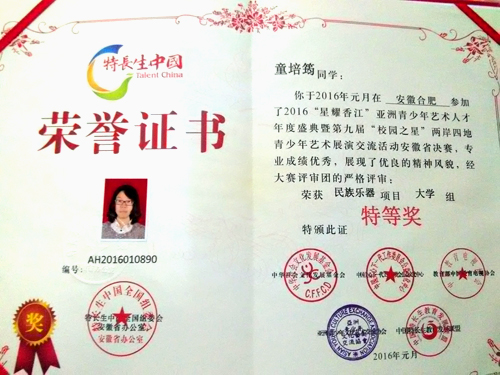 本网讯 由文化部中华社会文化发展基金会发起,教育部中国教育电视协会、中国关心下一代工作委员会公益文化中心等单位联合举办的两岸四地“校园之星”全国艺术风采展示活动在合肥成功举办。活动中,我校大学生民乐团童培筠同学演奏的古筝独奏《打虎上山》荣获民乐独奏第一名,宁愉加、童培筠、刘铭璇、贾丽颉、孙薇等五名同学演奏的古筝五重奏《战台风》获得民乐团体第一名。