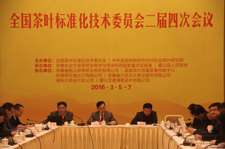 本网讯3月5日至7日,由全国茶叶标准化技术委员会(茶标委)、中华全国茶叶供销合作总社杭州茶叶研究院主办,安徽农业大学茶树生物学与资源利用国家重点实验室和霍山县人民政府承办的全国茶叶标准化技术委员会二届四次会议在合肥召开。来自全国各地的茶标委委员、观察员以及相关代表共计160余人参加了会议,会议由中华茶叶供销合作总社杭州茶叶研究院院长张士康主持。国家茶标委副主任、安徽农业大学党委书记宛晓春,茶标委顾问、福建省质量技术监督局总工程师刘绍文和湖南农业大学教授刘仲华,安徽省质量技术监督局标准化处处长程波,安徽省农业委员会质监处处长吕国文,茶标委秘书长翁昆,中国茶叶流通协会产业发展部部长申卫伟、安徽农业大学茶与食品科技学院党委书记崔云,院长张正竹等出席了会议。