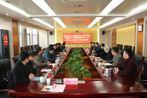 本网讯:3月13日下午,校党委书记宛晓春、副校长马传喜率办公室、人事处、教务处、财务处、国资处、经济技术学院等单位负责同志,赴安徽职业技术学院考察交流。安徽职业技术学院院党委书记亓四华、副院长陈行、纪委书记蒋永忠热情接待了宛晓春书记一行。