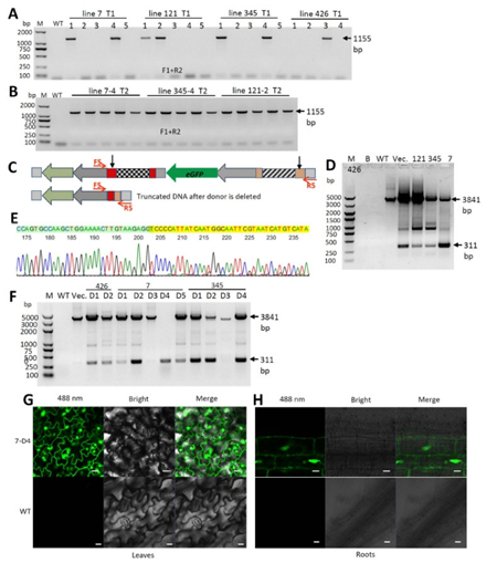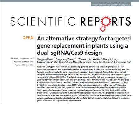 基因编辑技术可实现对受体基因组目标基因进行精确的敲除、删除、修改、替换或定点插入等定向突变,在从人类医学到植物遗传改良等领域具有广阔的应用空间。CRISPR/Cas9系统是继锌指核酸酶(ZFNs)和TALEN核酸酶技术之后,发展出来的基于RNA定点识别介导的定点核酸酶基因编辑技术,因其设计简便、操作简单,成为精确基因编辑技术重要发展方向。自2012年CRISPR/Cas9高效系统被成功研发以来,已在大量物种中开发应用。RNA指导的定点Cas9核酶酶能够在靶基因设计的位置产生DSB(doubled-strand breaks),并通过非同源重组末端连接(NHEJ,non-homologous end joining)和同源重组(HR,homologous recombination)两种途径进行修复。NHEJ途径易产生错配(缺失、插入或替换),成为基因敲除等定向突变的主要方式。虽然也可以通过NHEJ途径产生替换,但精准的基因或DNA替换突变主要还是依赖HR途径。理论上,基因替换可以根据设计在受体基因组上定点引入任何想要的突变,因此,技术上更难,且具有更重要的意义与潜在的应用价值。自2013年CRISPR/Cas9首次被用于植物当中之后,CRISPR/Cas9已成为基因突变与基因敲除的良好工具,但在基因替换方面一直未有成熟的系统可供应用。本研究首先利用双元RNA向导的CRISPR/Cas9系统分别对植物两个MiRNA基因基因座(MiR169a和MiR827a)Pri-miRNA区域实现了人工删除,删除的效率分别达到为20%和24%。在此基础上,尝试采用一个核定位表达的eGFP修改模板对TFL1基因的一个特定区段在删除的基础之上进行定点替换,DNA测序、目标基因删除、模板删除、目标替换基因整合、替换后基因的表达等系统的实验证据表明成功地实现了目标基因的替换。该技术可以作为目标基因(DNA)删除与基因替换的工具。当前,课题组在主要农作物玉米上的研究还表明基因编辑系统的效率更高,已发展成为基因功能鉴定研究重要的技术手段,而且已在玉米株型、育性、糯性等重要农艺性状上高效创制了具有重要产业应用价值的特异种质,为该技术在基础与应用研究奠定了丰富的技术、材料与经验基础。(蒋晓春 通讯员:魏晓飞)