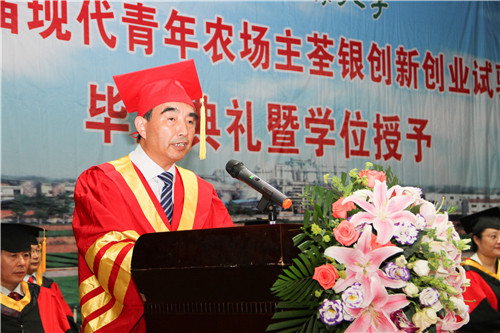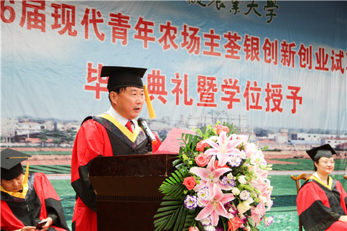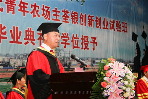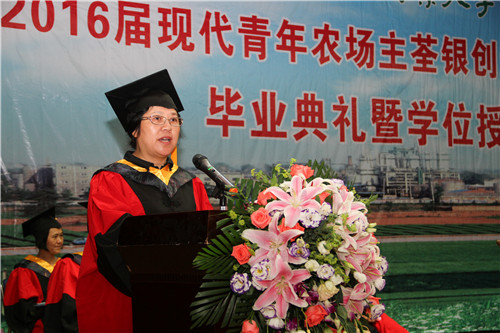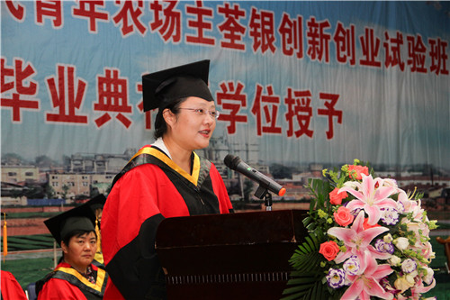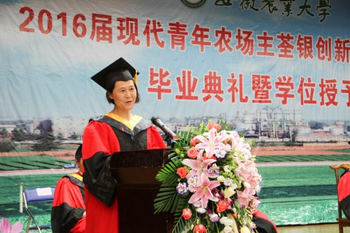 教师代表何文丽老师祝贺同学们成功毕业!希望毕业生携带着母校的期望,在广袤的土地上,书写现代农场主的理想,通过辛勤的耕耘,收获爱情与事业的成功,收获中国农业现代化的成功!