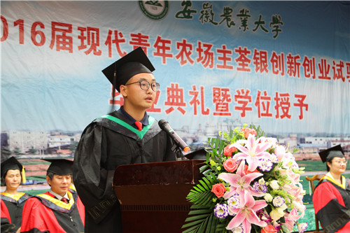 学生代表林立同学代表2016届现代青年农场主试验班发言。他代表青年农场主班全体毕业生向辛勤培育领导、老师,表达最衷心的感谢;向这么多年来辛勤操劳的父母,表示最崇高的敬意;向四年来一起朝夕相处兄弟姐妹们,表达最诚挚的祝福。 (农学院)