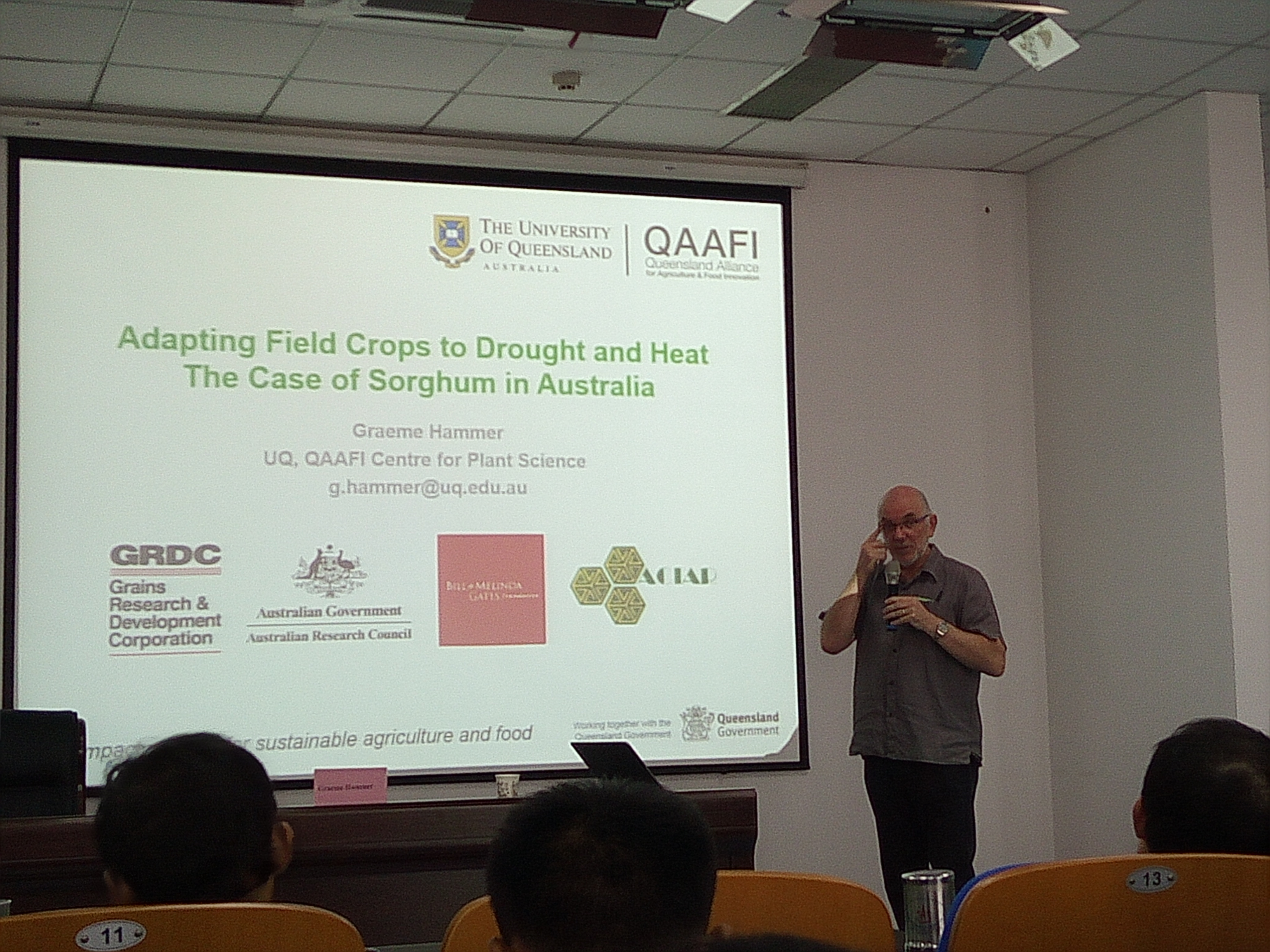 上午,Graeme Hammer教授做了题为“Adapting field crops to drought and heat – the case of sorghum in Australia”的学术报告,资源与环境学院院长郜红建教授、生命科学学院李培金教授、农学院副院长常成副教授、董召荣教授、宋有洪教授、司红起教授等教师和学生参加了学术报告会,报告会由农学院副院长武立权教授主持。