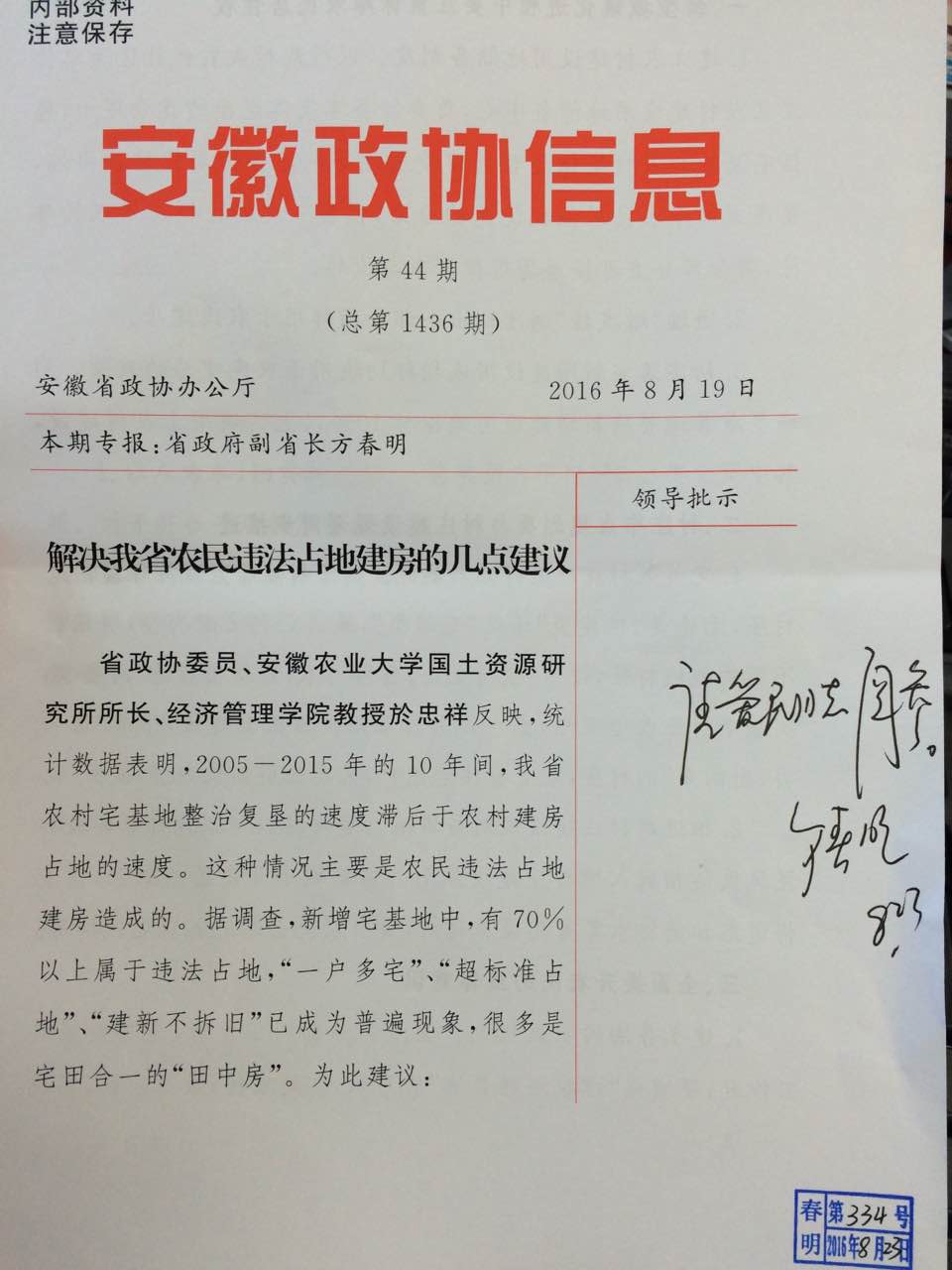 另据报道:於忠祥教授撰写的《解决我省农民违法占地建房的几点建议》刊登在《安徽政协信息》第44期上,受到安徽省副省长方春明的批示。(通讯员:何小佳)