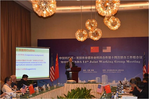 本网讯 2016年8月25日,中国科技部-美国农业部农业科技合作第十四次联合工作组会议在广东珠海召开。校党委书记宛晓春、副校长姚佐文以及新农院负责人等应邀参加了会议。中国科技部副部长徐南平和美国农业部副部长凯瑟琳?渥特基(Catherine Woteki)出席会议并讲话,广东省人民政府副省长袁宝成参加会议并致辞。