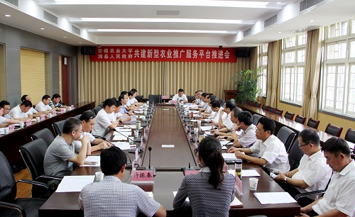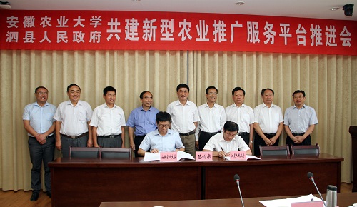 程备久校长对我校发展情况,人才培养模式,学科建设及我校在构建大学推广模式上的探索和“1288”办学格局做了介绍,希望依托我校人才科技优势,以“一站一盟一中心”的推广模式和“四体融合”的新型农业推广服务模式,进一步推动泗县农业的发展。新农村发展研究院执行副院长张承祥汇报了共建协议的主要内容。