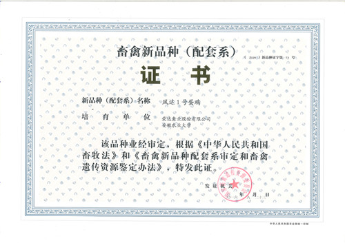 “凤达1号蛋鸡”由三系配套构成,商品代适应性好、成活率高,72周龄产蛋量280~290个,产蛋期料蛋比约2.4:1,蛋壳粉色,平均蛋重50~51克,蛋黄比例高达31~32%,蛋白浓厚,蛋品质优良,风味纯正,具备我国地方鸡蛋(俗称“土鸡蛋”)优点。“凤达1号蛋鸡”新品种的诞生,实现了我省国家级蛋鸡品种零的突破,是我校产学研合作又一重要成果。
