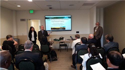 在此次大会上,我校副校长马传喜教授以“中国农业推广体系的演变与发展”为题,向与会人员介绍了我国农业推广体系的系统历史沿革、主要历史特征和具体历史实践,集中阐述了当前农业推广体系面临的挑战和机遇,重点指出了大学推广模式的实践与创新。科罗拉多州立大学Rick Miranda教务长、执行副校长、Lou Swanson副校长、Jim Cooney副教务长,美国农业部美国粮食与农业研究所主任Sonny Ramaswamy、俄勒冈州立大学副教务长Scott Reed、普渡大学推广系统助理项目负责人Michael Wilcox和加州大学副校长Glenda Humiston以及沈阳农业大学王海龙副处长、金寨县农委解正定副主任、中国高等教育出版社副总编辑龙杰等分别就中美农业推广合作、新型大学推广模式构建、农业科技转移与推广、新型职业农民培训、校地产学研联盟合作模式创新等主题,作了主旨报告。与会代表还就中美推广实践对比、美国推广体系发展现状以及其他农业科技领域问题进行了深入交流和探讨。