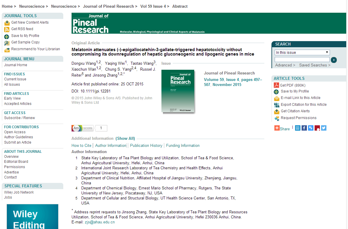 据了解,《Journal of Pineal Research》杂志由John Wiley & Sons, Inc.出版发行,是目前国际生理学领域最具影响力的综合性刊物之一,2014年度在生理学同类期刊中的影响因子排名第3位。(茶树生物学与资源利用国家重点实验室)