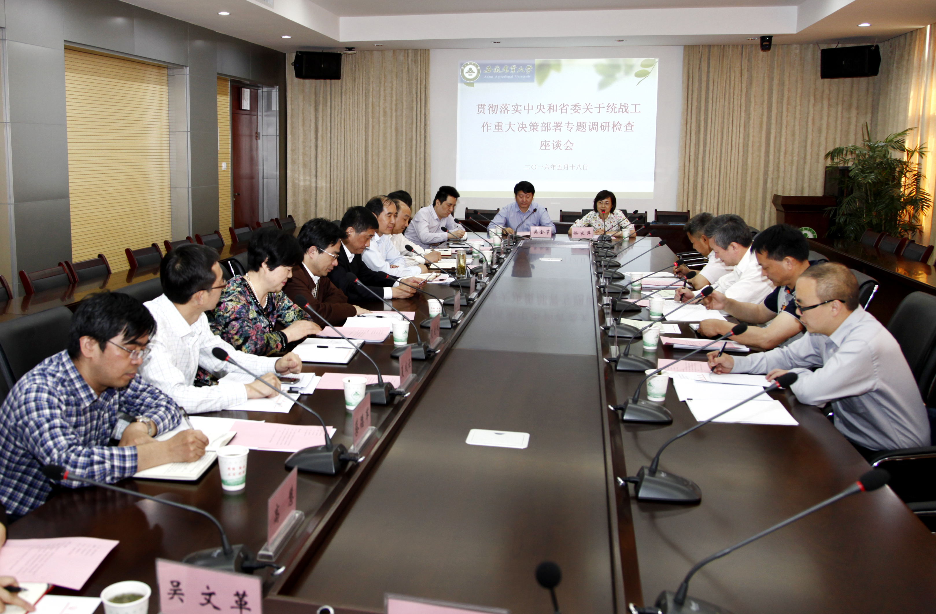 宛晓春书记代表校党委对省调研检查组一行来学校指导统战工作表示欢迎。他说,校党委历来对统战工作重度重视,对党外人士政治上主动关心,工作全力支持,充分发挥他们在学校建设和发展中的作用,对党外人才始终坚持信任和平等的原则。在校党委重大问题的决策过程中高度重视党外代表人士的建议,在学校重大干部任免工作中也充分听取党外代表人士意见;及时认同党外代表人士参政议政、社会服务所取得的成绩,并将他们参政议政成果纳入学校的年终奖励计划;对党外干部培养使用和党内干部一视同仁。今后,学校还将在党派班子建设、党外后备干部培养以及归国留学人员等工作上进一步加强。