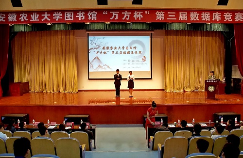 本网讯 5月22日下午,由图书馆和团委共同主办的安徽农业大学“万方杯”第三届数据库竞赛决赛在图书馆第一学术报告厅正式拉开帷幕。出席此次竞赛的嘉宾有图书馆馆长吴文革、副馆长吴永辉、合肥工业大学图书馆副馆长蔡灶林、上海万方数据有限公司安徽区域经理陈丽等,图书馆信息素质教研室相关老师担任此次竞赛的评委。