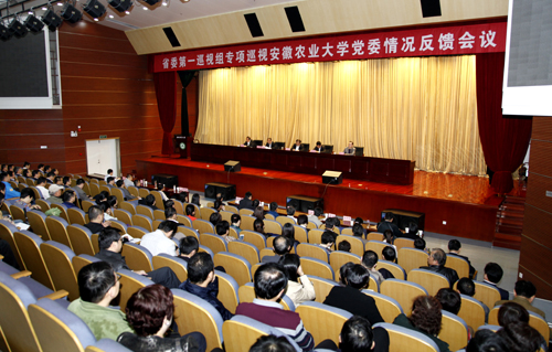 本网讯 2016年10月20日,安徽农业大学召开省委第一巡视组专项巡视安徽农业大学党委情况反馈会议。省委第一巡视组组长孟庆银传达了省委书记李锦斌在省委“五人小组”会议上听取九届省委第十三轮巡视情况汇报时的重要讲话,向安徽农业大学党委反馈了巡视情况。省纪委驻省教育厅纪检组组长王光虎同志出席会议并提出整改要求。安徽农业大学党委书记宛晓春同志作了表态发言。安徽农业大学校长程备久同志主持了会议。