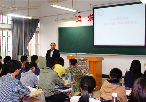 本网讯 为了更好的掌握本科生上课实际情况,更多的与本科生交流互动,10月25日下午四点,校长程备久教授莅临博学楼416教室,为生命科学学院2014级生物类创新实验班学子做了《玉米基因家族进化分析与功能基因发展》的专题学术报告。学院2014级生物类创新实验班全体学生聆听了报告。