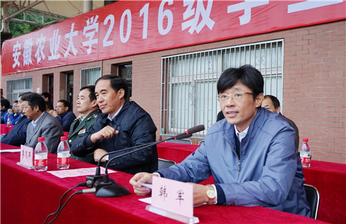 本网讯 秋风飒爽,丹桂飘香,10月29日下午3点,伴随着庄严的国歌声,安徽农业大学2016级新生军训汇报表演暨总结大会在田径场隆重举行,4300余名军训新生接受了校领导和嘉宾的检阅,其中由800余名同学组成的15个会操方阵和3个表演方阵进行了会操评比和汇报演出,为新学期的第一堂必修课交上了满意的答卷。至此为期14天的新生军训圆满结束。校党委副书记李恩年、副校长韩军、军训团团长涂德润、军训团政委彭庆刚、解放军陆军军官学院军训教研室主任曹书成大校、校各职能部门负责人及各学院副书记出席。
