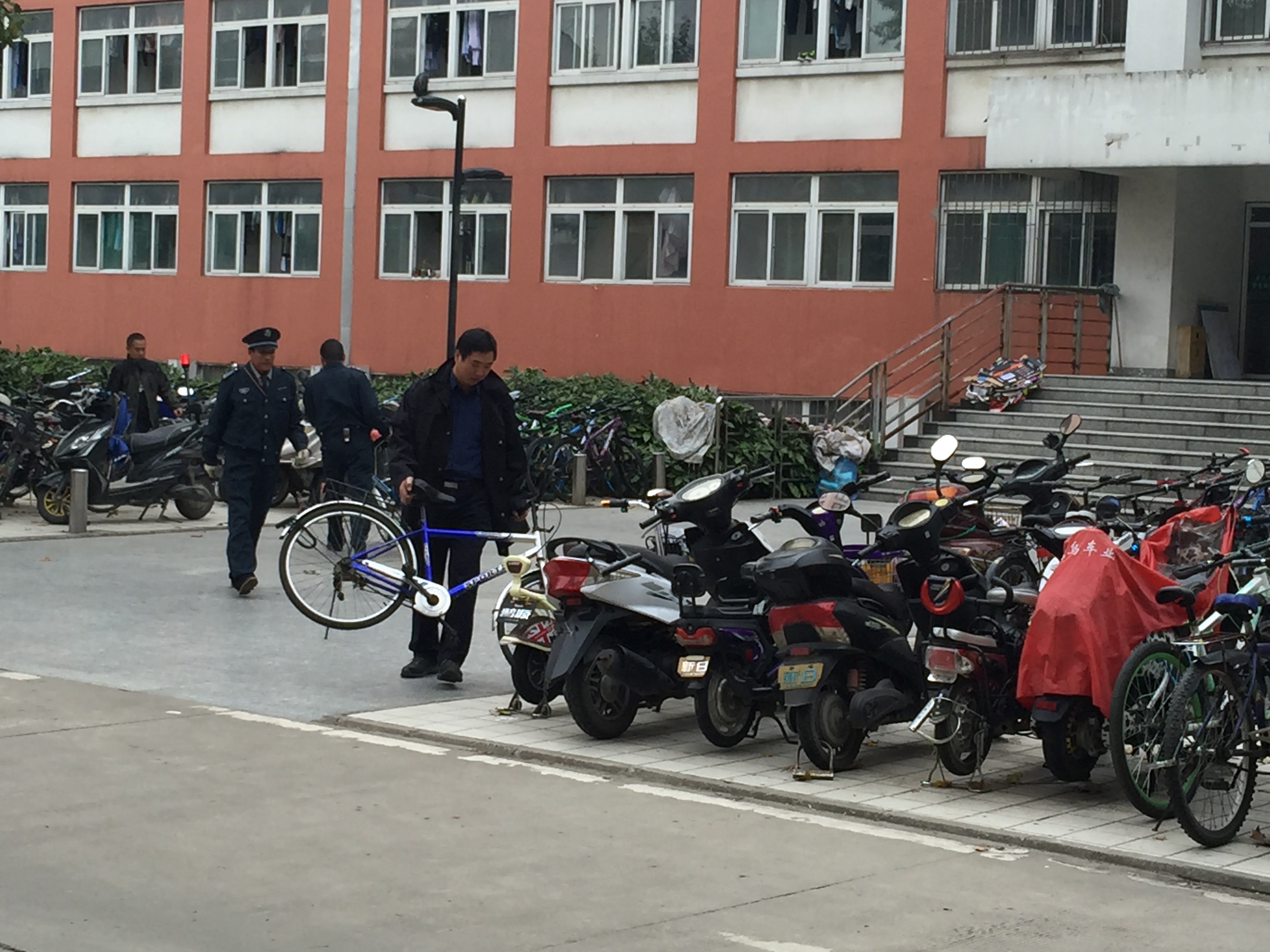 11月9日早晨8时,早会上保卫处处长涂德润对此次整治工作进行了专题部署和责任分工,全处各科室迅速组织人手,全员上阵,对东门口原禾禾餐厅和超市门口人行道上违规停放和废弃的70余辆非机动车进行集中归置,并分别转移到原禾禾餐厅西侧和一号宿舍楼前非机动车停车场,同时对长期“沉睡”的“僵尸车”收拢清理,还路于师生。此次非机动车专项清理与整治行动,初步缓解了校园内东门人车拥堵现象,取得了阶段性效果。
