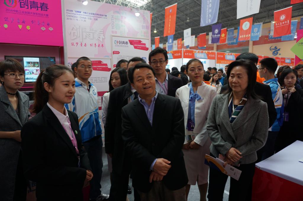 本网讯 11月19日,为期五天的2016年“创青春”全国大学生创业大赛终审决赛在电子科技大学落下帷幕,由我校植物保护学院丁克坚、丁朝阳老师指导的卢丽斌、施洁琼、乔丹等同学的公益创业赛作品《安徽省农作物病虫监测预警有限公司》荣获银奖。大赛期间,团中央书记处书记傅振邦到我校作品展位听取了参赛学生对项目的相关介绍。