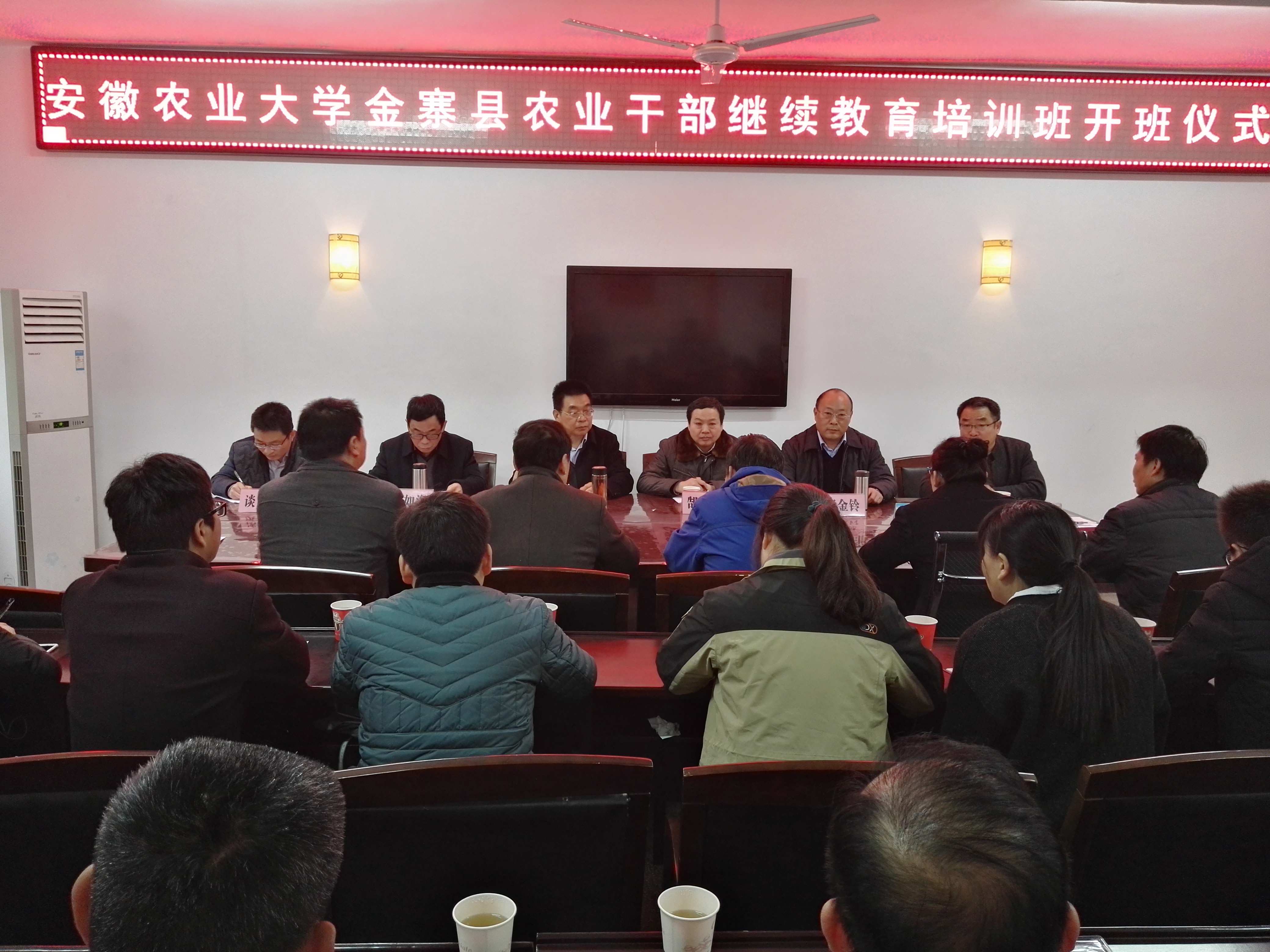 本网讯:12月20日上午,由金寨县农发委主办,我校继续教育学院与资源与环境学院共同承办的“安徽农业大学•金寨县农业干部继续教育”在金寨开班。继续教育学院院长何如海、资源与环境学院院长郜红建、副院长谈应权,金寨县副县长何金铃,培训专家代表胡桂芳等出席开班仪式。开班典礼由金寨县农发委副主任杨贵标主持。