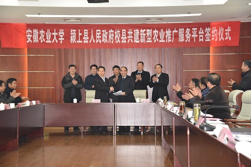 本网讯12月20日上午,安徽农业大学·颍上县人民政府共建新型推广服务平台签约仪式在颍上县政府会议中心举行。校长程备久、颍上县县长窦灿辉分别代表校县双方签署合作协议。副校长姚佐文、颍上县县委书记熊德超、副县长吴建军出席签约仪式。仪式由颍上县县委书记熊德超主持。