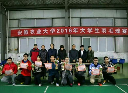 本网讯12月24日上午,安徽农业大学2016年大学生羽毛球赛在第三运动场羽毛球馆开赛,16个学院代表队参加了本次比赛,经过两天的团结合作、顽强拼搏,植物保护学院、研究生学院、信息与计算机学院获得混合团体赛的冠、亚、季军,林学与园林学院、生命科学学院、动物科技学院、工学院和经济管理学院分别获得第四至第八名。研究生学院、林学院、工学院、动物科技学院、植物保护学院、体育部等相关学院负责人出席了闭幕式,并为获得前八名的学院代表队颁奖。