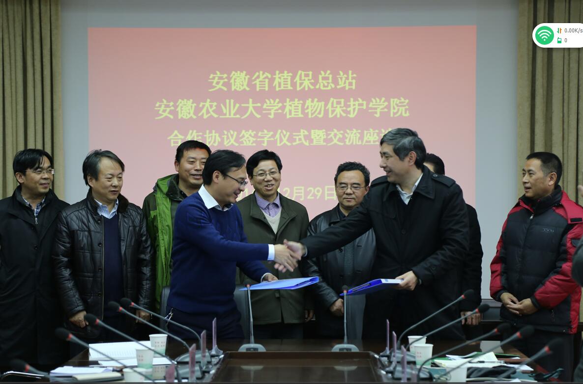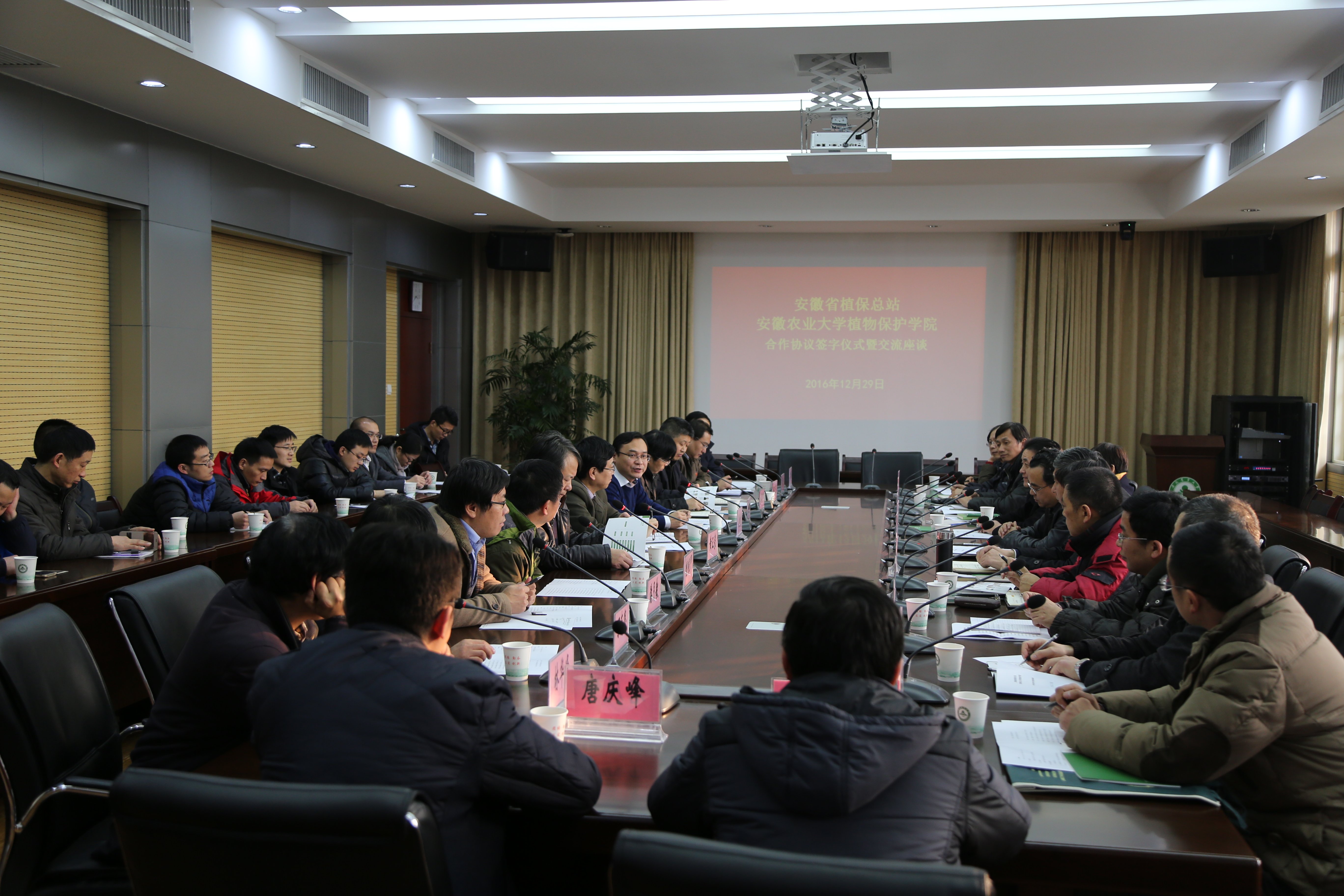 本网讯:12月29日,安徽省植物保护总站与我校植物保护学院合作协议签字仪式暨交流座谈会在校第三会议室举行。校党委常委、纪委书记裴树东,省农委副主任朱永东,校科技处副处长蔡德军,校农业园副主任、皖中综合试验站站长黄正来出席了会议,植保总站副站长(主持工作)黄秋云、副所长曹明坤、副调研员李钢、各科室负责人以及植保学院党政领导、系部主任、全体教师等参加了会议。会议由植物保护学院党委书记檀根甲主持。