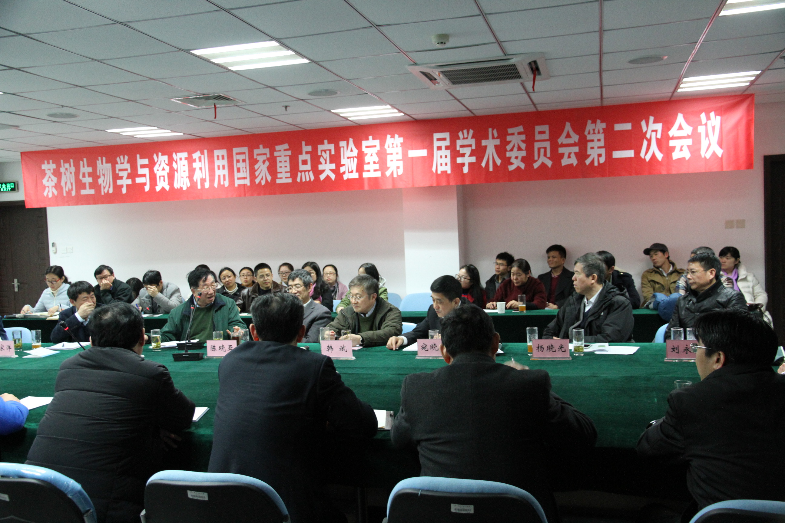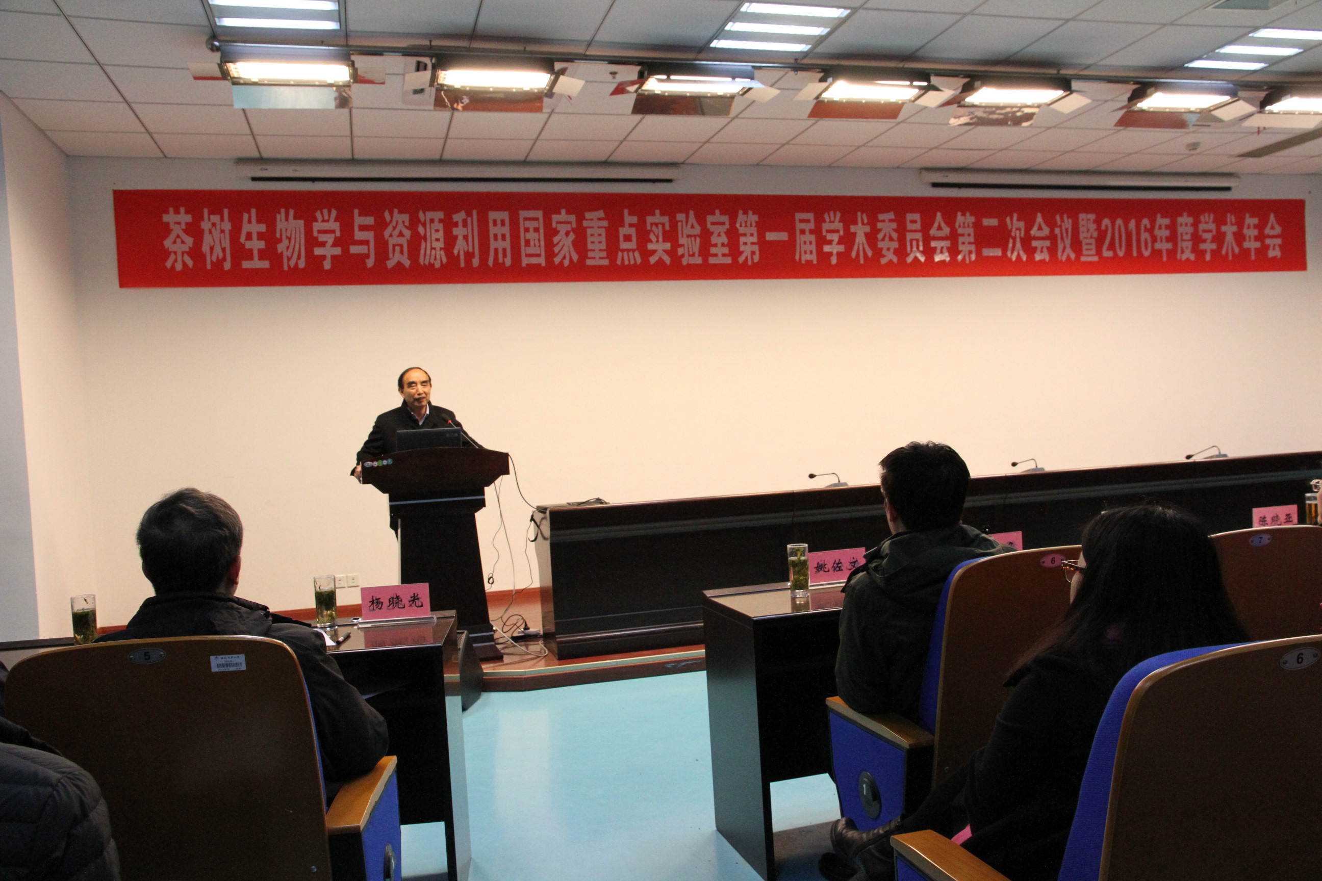 本网讯 2017年1月7日,茶树生物学与资源利用国家重点实验室“第一届学术委员会第二次会议暨2016年度学术年会”在生物科技楼441举行。实验室学术委员会主任委员、中国农业院茶叶研究所陈宗懋院士,副主任委员、中科院上海生命科学研究院植物生理生态研究所陈晓亚院士、中国农业科学院李家洋院士、中国科学院国家基因研究中心韩斌院士,委员、浙江大学梁月荣教授、中国疾病预防控制中心杨晓光研究员、合肥工业大学刘永胜教授、南京林业大学尹佟明教授、安徽农业大学宛晓春教授,安徽农业大学校长程备久、副校长夏涛、姚佐文应邀出席本次年会。程备久在开幕式上致欢迎词。实验室各PI研究团队负责人、团队成员和研究生与博士后列席会议。
