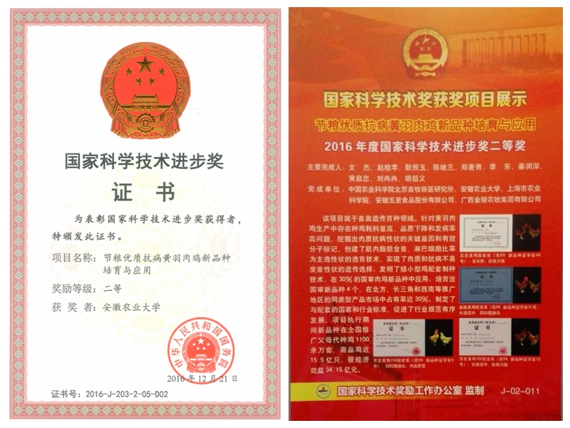本网讯1月9日,国家科学技术奖励大会在北京人民大会堂举行,大会揭晓了2016年国家科学技术奖等各项奖项。安徽农业大学作为第二完成单位,参与中国农业科学院北京畜牧兽医研究所文杰研究员课题组完成的“节粮优质抗病黄羽肉鸡新品种培育与应用”荣获国家科技进步二等奖。我校动物科技学院“家禽功能基因发掘与生物育种团队”耿照玉教授和姜润深教授,多年来与中国农业科学院北京畜牧兽医研究所合作,针对我国黄羽肉鸡生产中存在生产效率低、肉品质下降、疾病发生率高等问题,利用现代遗传育种技术,挖掘出肉质抗病性状的关键基因和有效分子标记,创建了新的选育技术,并成功培育了黄羽肉鸡新品种。培育的黄羽肉鸡新品种在全国多地推广,获良好的经济效益和社会效益。