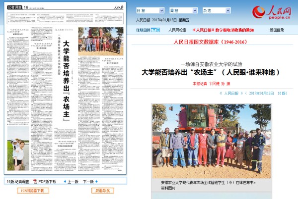 本网讯 今天出版的《人民日报》第16版以《大学能否培养出“农场主”(人民眼·谁来种地)》为题整版报道了我校青年农场主事迹,这是我校事迹首次在《人民日报》上整版报道。