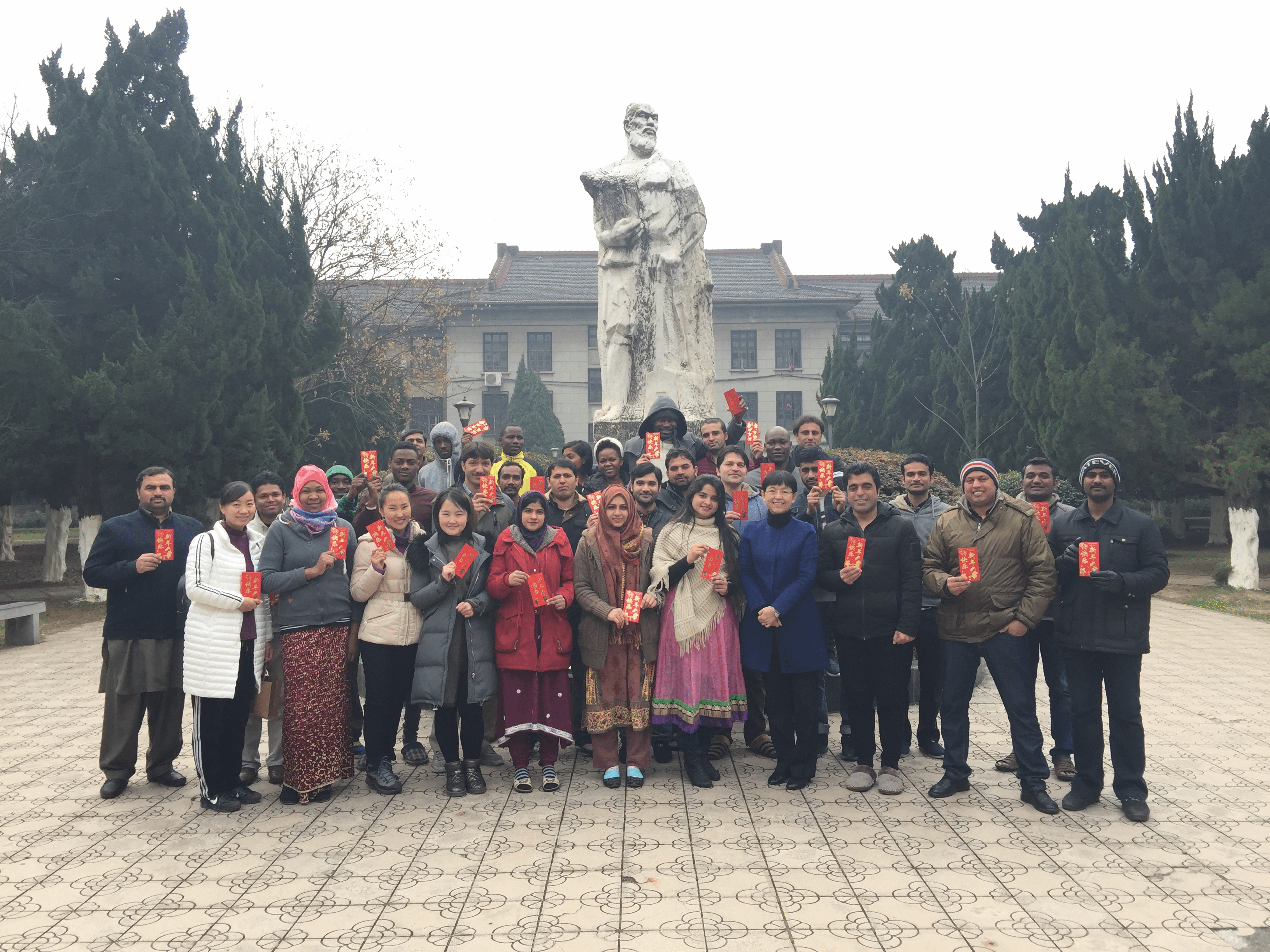 老师们挨个走访了学生宿舍,与留学生们互相表达了新春祝福,并发放了慰问红包。学生们也与老师们热情交流,纷纷表示新春佳节是中国最传统最隆重的节日,自己也已深深地融入到节日的气氛中去。慰问活动结束后,全体在校留学生来到了神农氏下合影留念。