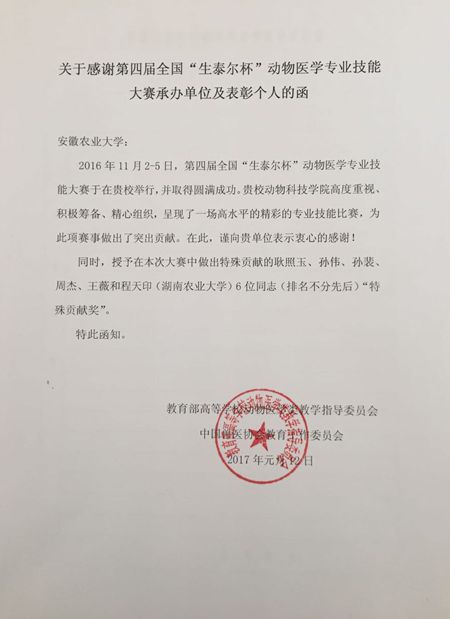 本网讯近日,教育部高等学校动物医学类教学指导委员会、中国兽医协会教育工作委员会给我校发来感谢信,感谢我校在第四届全国“生泰尔杯”动物医学专业技能大赛中所做出的突出工作,并授予我校耿照玉等6位同志“特殊贡献奖”。