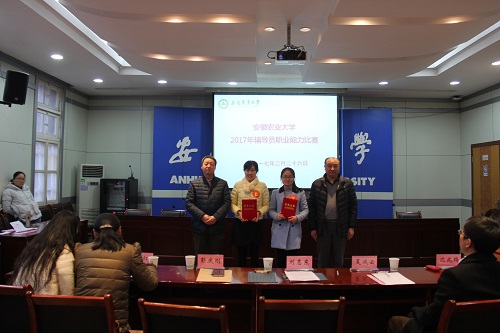 本网讯为进一步提升辅导员职业素养和能力,不断促进辅导员队伍职业化、专业化发展,2月23日至26日,我校举办了2017年辅导员职业能力比赛。校党委组织部、宣传部、统战部、学工部(处)、招生就业处、团委等单位负责人和我校获得安徽省往届辅导员职业能力比赛一等奖的老师担任评委。