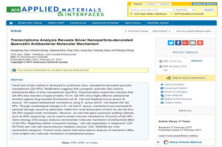 本网讯近日生命科学学院生物制药系汪维云教授团队在知名学术期刊美国化学学会期刊《ACS Applied Materials & Interfaces》(SCI一区,IF:7.13)发表高水平学术论文:“Transcriptome Analysis Reveals Silver Nanoparticle-decorated Quercetin Antibacterial Molecular Mechanism”(DOI: 10.1021/acsami.7b02380)。团队主要开展为天然产物纳米药物的开发与活性研究。本文第一作者为我院孙冬冬副教授,共同一作张伟伟为生命科学学院博士生,汪维云教授为通讯作者,安徽农业大学为论文的第一及通讯单位。