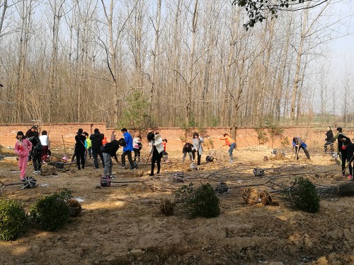 上午九时,农业园林业专家为大家介绍了植树主要技术要领和工作流程,分发树苗和种植工具。大家自由组合,两人一组,挖坑、选苗、栽植、回填、覆土、浇水……一颗颗树苗,在空中舒展开了枝丫,随风摆动。经过二个多小时的劳动,50余颗樱花、黄杨整齐的排列在地里,“总务林”初显规模。孩子们在心愿卡上写下美好的祝愿,挂在自己亲手种下的小树枝头。大家种下了绿色和希望,收获的是快乐与健康。