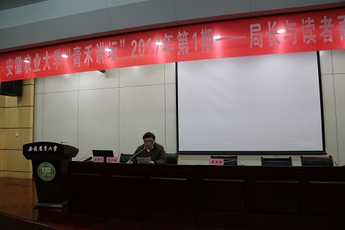 本网讯 3月22日下午3:00,“时代书苑·青禾讲坛”迎来了2017年第1讲(总第5讲),安徽省档案馆馆长、安徽省档案局党组书记、安徽省档案局局长黄玉明作客青禾讲坛,在校图书馆第2学术报告厅为我校师生做了一场题为《局长与读者面对面:历史档案中的安徽读书人》的读书报告会。学术报告厅内座无虚席,近200名师生齐聚一堂聆听了本次报告会,图书馆副馆长简少明主持本场读书报告会。