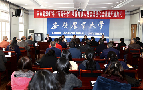 本网讯3月31日上午,农业部2017年“南南合作”项目外派人员法语培训班在我校开班,来自安徽、湖北、湖南及广西的20名农业技术人员将在我校进行为期一个月的培训。农业部国际合作司副司长唐盛尧,安徽省农委党组成员、总农艺师汤高平,我校校长程备久、副校长姚佐文出席开班仪式并讲话。农业部国际交流服务中心、国际合作司、安徽省农委外事外经处、我校国际交流与合作处和外国语学院等单位负责人,以及培训班全体教师和学员参加了开班仪式。农业部国际交流服务中心副主任罗鸣主持开班仪式。