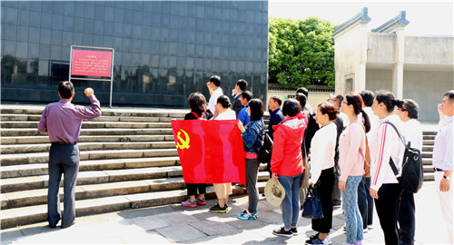 鲜红的党旗,耀眼的党徽。在皖南烈士陵园,三个支部全体党员,面对鲜艳的党旗,高举右手,重温了入党誓词,铿锵的誓言响彻广场上空;无名烈士墓前,大家静静默哀,凭吊先烈;长明灯下,感受到烈士的英灵与日月同辉,浩气长存。