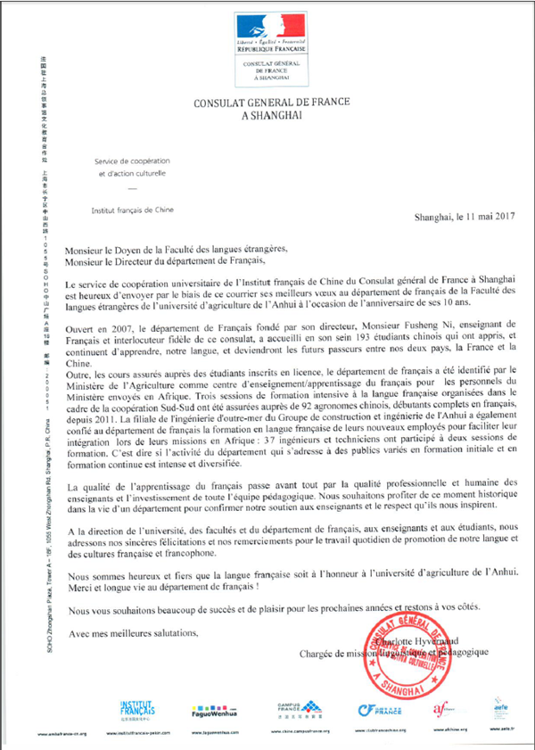 本网讯今年适逢我校外国语学院法语系建系十周年,5月11日,法国驻沪总领事馆专门发来贺信,向我校表示热烈祝贺,对法语专业十年来的办学成就表示高度评价,也对我校十年来为传播法国语言和文化所做的工作表示衷心感谢。
