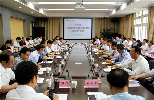 本网讯 5月25日上午,安徽省委党校高校党委书记班一行60余人来我校开展以“遵循教书育人规律 探索实践育人途径”为主题的调研活动,校党委书记江春陪同调研并主持召开座谈会,校长程备久出席座谈会,校纪委书记裴树东,副校长蒋家平、韩军陪同调研。