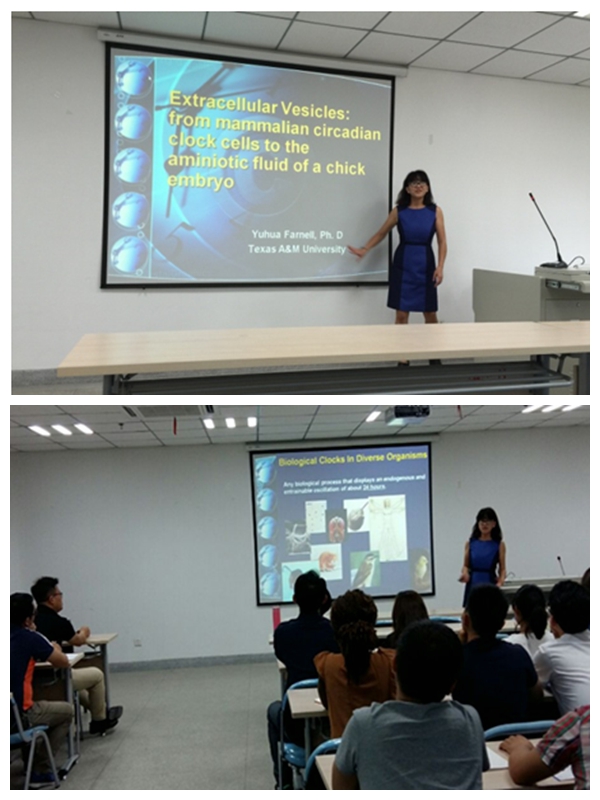 本网讯 5月26日,应动物科技学院和科技处邀请,美国德克萨斯A&M大学(Texas A&M University)农业和生命学院家禽系张玉华教授来学校交流,并给师生们做“鸡胚羊水中与哺乳动物生物钟细胞相关物质检测与鉴定(Extracellular vesicles: from mammalian neural clock cells to the amniotic fluid of chicken embryo)报告。动物科技学院院长耿照玉教授主持会议。
