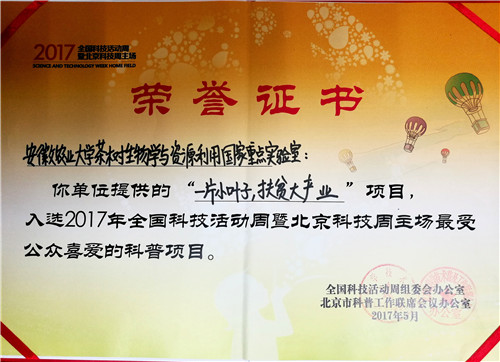闭幕式上,我校提供的“一片小叶子,扶贫大产业”项目,因有效地普及了茶叶科学知识,展示了科技扶贫、精准脱贫的最新成果,获得了科技部农村中心、参展人员、广大市民和媒体记者的一致好评和广泛热议,大会组委会经过评选,一致推荐入选“2017年全国科技活动周暨北京科技周主场最受公众喜爱的科普项目”。