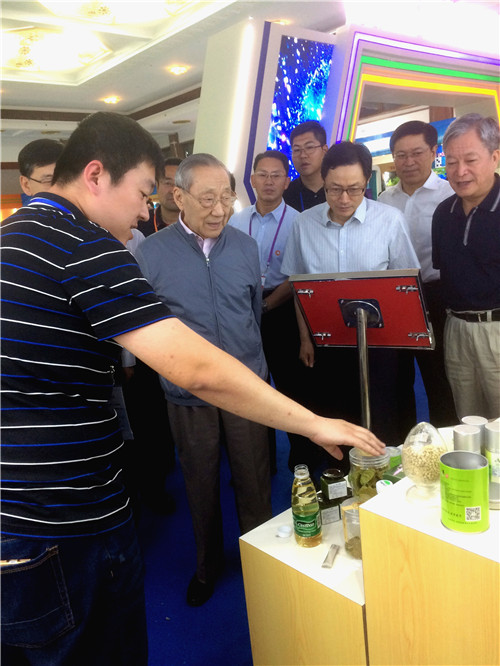 在观看工作人员现场演示我校自主研发的速溶茶系列产品,能在常温下迅速溶解于瓶装水,并保留了原有的茶风味时,原中共中央政治局常委、国务院副总理李岚清连声说“好,好,好”。