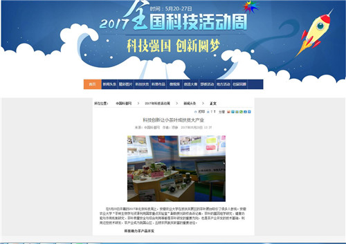为做好此次参展,国家重点实验室以“茶叶——一片小叶子,扶贫大产业”为主题,精心设计了涵盖中国茶叶在世界茶产业中的地位与影响、茶产业在中国山丘区农民脱贫致富中的作用、安徽茶产业扶贫成效、茶叶科普知识、我校振兴茶产业的主要做法、茶学国家重点实验室主要技术成果的文字宣传材料;在实物展台上,重点展示了我校自主研制的茶叶机械、茶叶深加工系列产品,陈列了六大基本茶类的干茶实物样与各类茶制品等。最新的茶叶科技成果及异彩纷呈的茶制品,吸引了众多参观者驻足停留、倾心听取介绍,也引起了众多新闻媒体的广泛关注。中国科普网以“科技创新让小茶叶成扶贫大产业”为题,在网站首条刊发了对我校参展项目的专题采访。