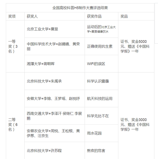 据悉,大赛共收到近百所高校约400件科普H5作品。经过中国科学院刘嘉麒院士、中国工程院张履谦院士等3位院士,2位科普专家,2位科技部门工作者,3位新媒体领域专家,2位媒体专家,4位大学宣传部长组成的专家评委会认真、细致、严格的评审,最终评选出一等奖3项、二等奖6项、三等奖10项、佳作奖20项。