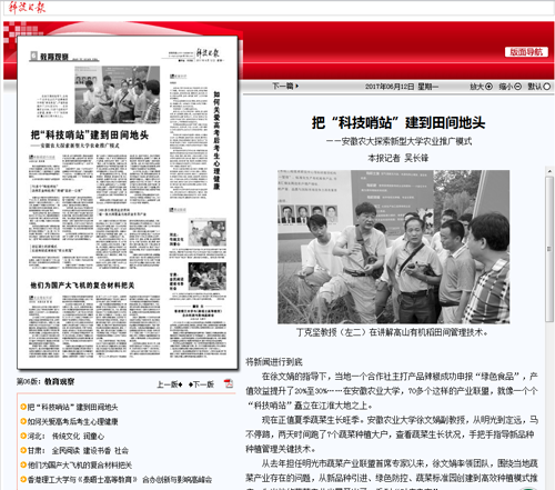 本网讯 6月12日出版的《科技日报》第6版,以“把‘科技哨站’建到田间地头——安徽农大探索新型大学农业推广模式”为题,报道了我校新农村发展研究院事迹。