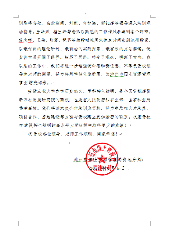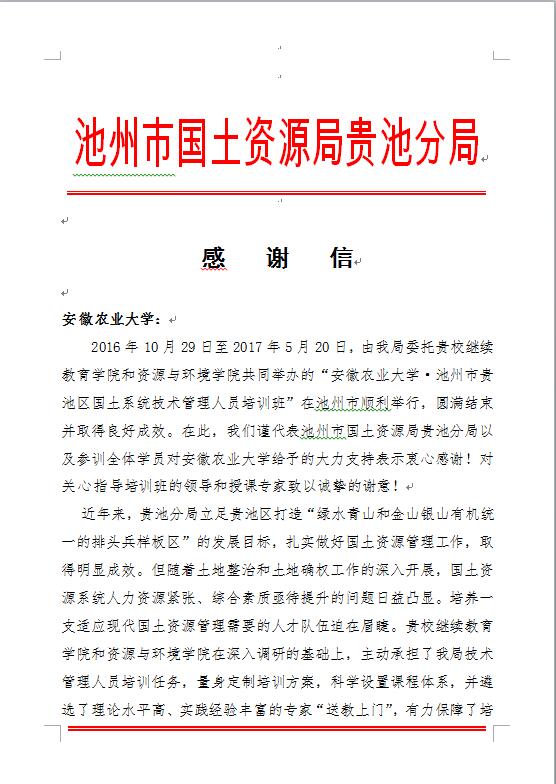 本网讯 近日,由我校承办的《安徽农业大学·池州市贵池区国土系统技术管理人员培训班》顺利结束。池州市国土资源局贵池分局为感谢我校在培训中给予大力支持和关心,特发来感谢信。