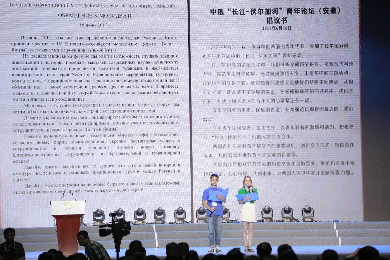 6月16日下午,第四届中俄“长江—伏尔加河”青年论坛闭幕式在安徽大学举行。国务委员杨洁篪、俄罗斯总统全权代表巴比奇出席讲话,并为中俄青年友谊林纪念石揭幕。省委书记李锦斌,省长李国英,省委常委、秘书长唐承沛,副省长张曙光,省政府秘书长侯淅珉;省委教育工委书记张岳峰、省教育厅厅长李和平、我校副校长姚佐文等出席闭幕式。闭幕式播放了中俄青年论坛精彩回顾视频,我校俄罗斯营员,开幕式发言代表玛什科夫采娃·瓦列里亚·奥列格夫娜在闭幕式上作为俄方青年代表与中国青年代表共同发表了《安徽倡议书》。