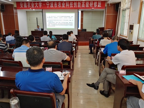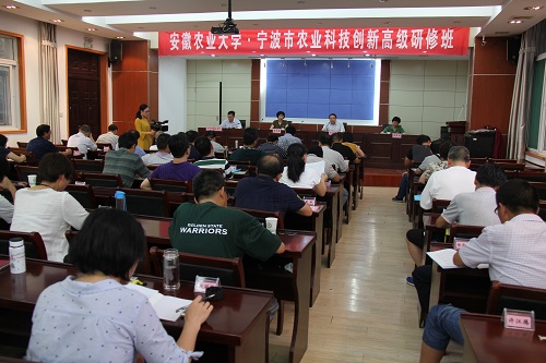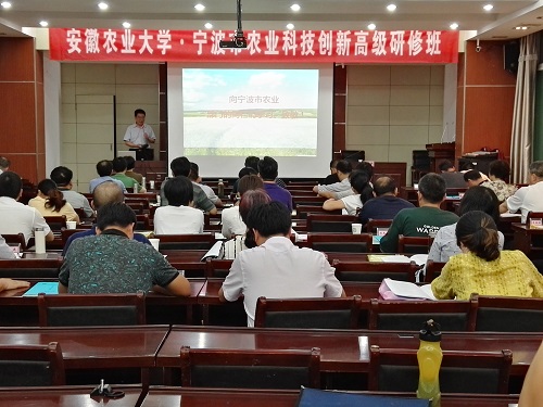 本网讯7月3日,由浙江省宁波市农业局主办,我校继续教育学院承办的“安徽农业大学•宁波市农业科技创新高级研修班”在我校顺利开班。宁波市农业局副局长朱红霞、农业局科教处处长朱秀丽,新农村发展研究院党总支书记王华君出席开班典礼。来自宁波市农业系统50名农业科技专家参加培训。