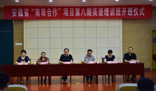 本网讯7月9日上午,由我校承办的安徽省“南南合作”项目第八期英语培训班开班典礼在外国语学院举行。校党委常委、副校长蒋家平,省农委外事外经处处长韦艾平、副处级调研员闫玉玲出席仪式。仪式由国际交流合作处处长姜红主持,外国语学院党政领导姚莉、孙志农、黄庆华及全体学员、任课教师参加了活动。