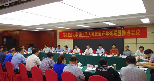 本网讯7月11日上午,安徽农业大学•颍上县人民政府校县产学研联盟推进会在颍上县召开。校党委书记江春,校长程备久,副校长姚佐文,颍上县委副书记丁思彬、副县长吴建军出席会议并讲话。会议由颍上县委副书记丁思彬主持。