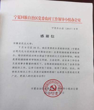 本网讯 近日,宁夏回族自治区党委农办系统《宁夏农业现代化与农村改革专题培训班》在我校成功举办。为感谢我校在培训期间提供的支持和帮助,特发来感谢信。