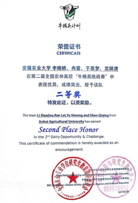 本网讯 7月19-22日,第二届全国农林高校“牛精英挑战赛”在哈尔滨顺利举行。由李晓娇、冉雷、于思梦和沈琪清等4位同学组成的我校代表队荣获大赛二等奖。